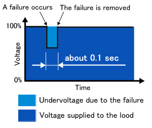 Our products can cope with real-world voltage dips and reliably compensate for continuous voltage dips in the event of multiple lightning strikes. The mechanism is designed to eliminate unnecessary power consumption. Maintenance costs are reduced because there is no need to replace power storage devices. No temperature control (air conditioning) is required, either. The equipment offers cost-efficient solutions against voltage dips. The equipment is compact and can be installed even in a small space.