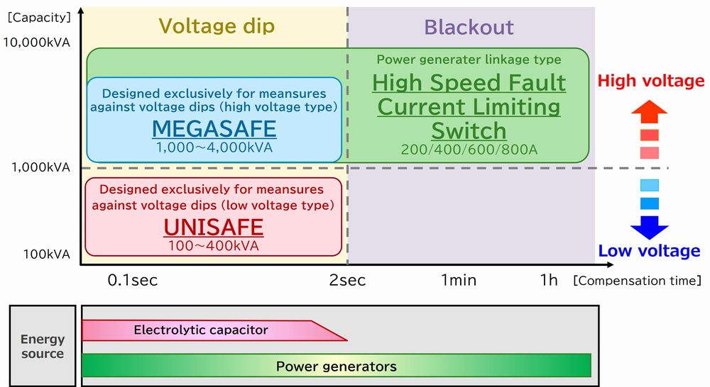 Notably, the UNISAFE and MEGASAFE, which are exclusively designed to cope with voltage dips, focus on compensating for voltage dips. The cost-effective equipment achieves low prices, space reduction, high efficiency, and low maintenance.